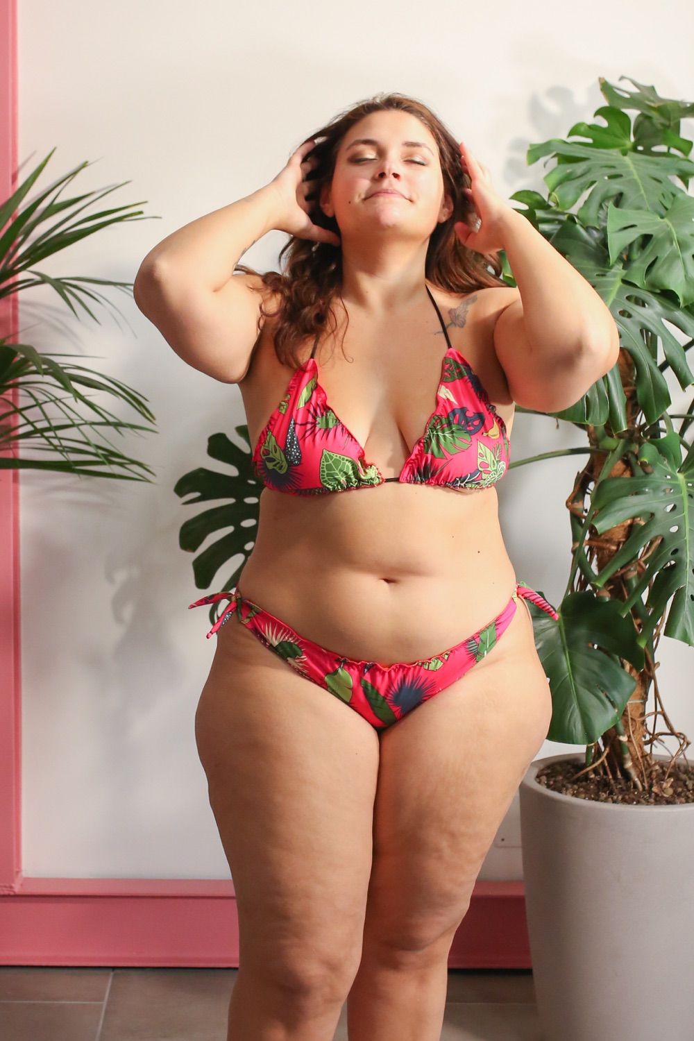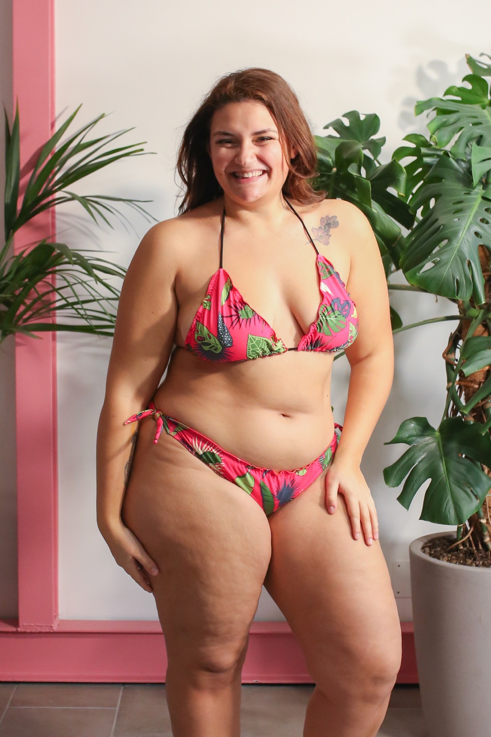 Il modello bikini arricciato (con top a fascia o a triangolo) ha un taglio comodo e dalla ampia vestibilità. Lo slip è arricciato con un elastico interno in silicone trasparente ed è regolabile ai lati grazie ai fiocchetti. Lo slip ha una sgambatura regolare, ed una altezza coprente (regolabile sia grazie all’arricciatura dell’orlo sia in base a quanto viene stretto lateralmente, quindi potete tenerlo lento e abbassato o più teso e più alto). Sul retro il taglio dello dello slip è comodo e coprente.