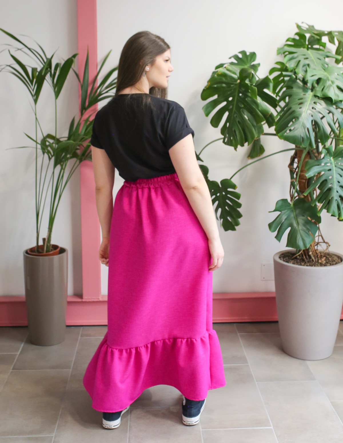 Gonna lunga con balza in morbida e leggero poliestere leggermente elasticizzato, comodo elastico in vita.